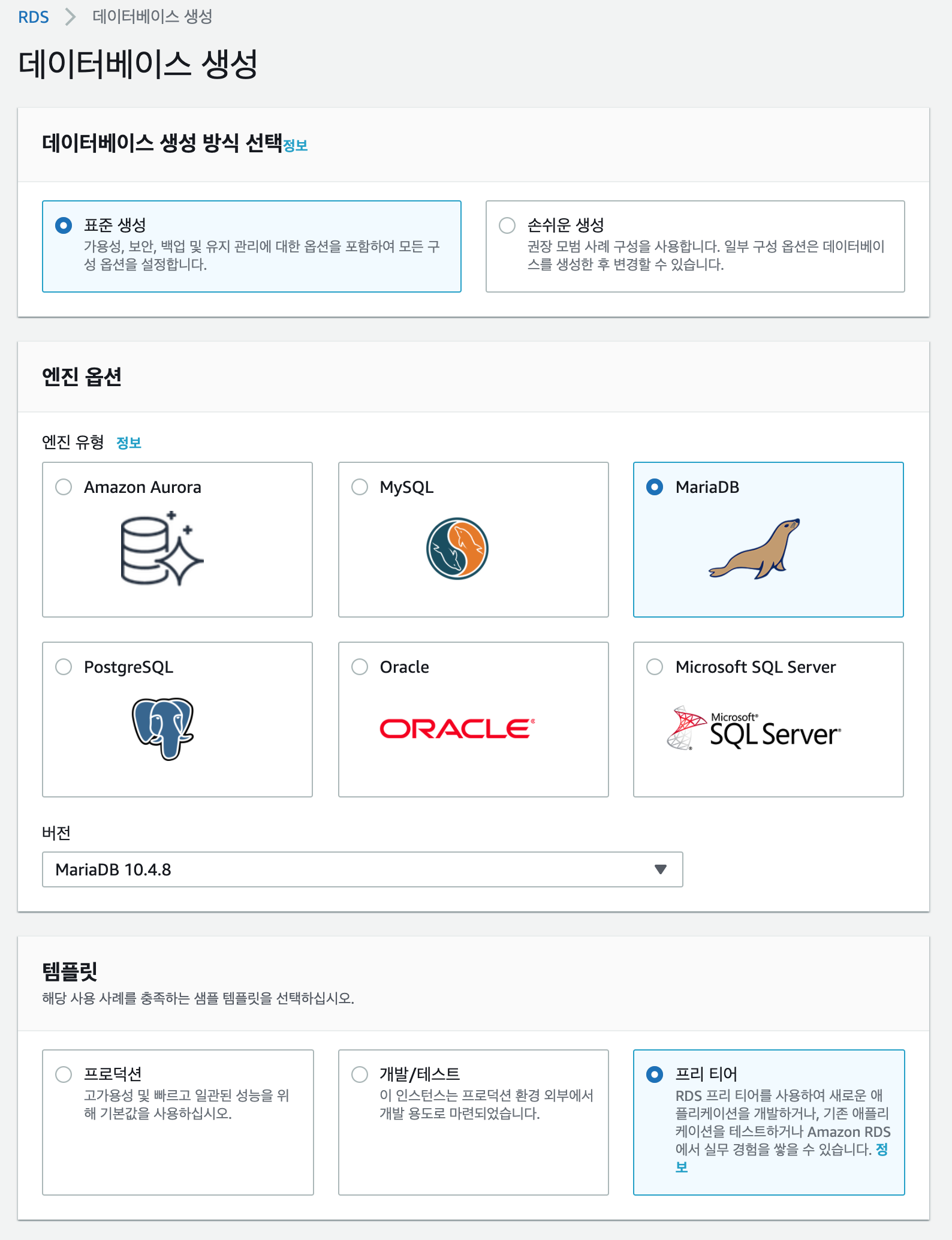 3. MariaDB를 사용합니다. 옵션은 아래와 같이 선택해주세요
