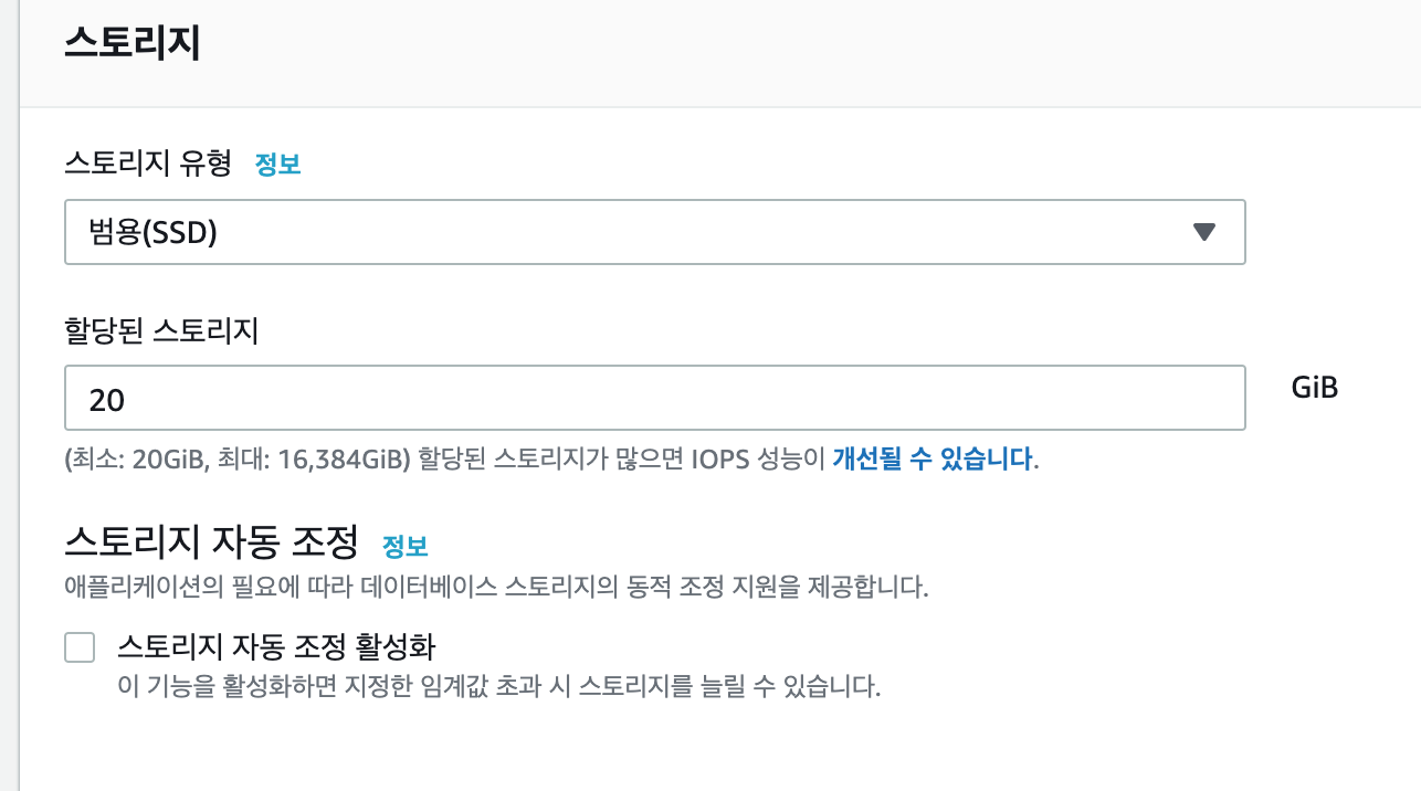 실습 용도로 사용하기에 할당 스토리지 크기는 20으로 지정합니다. 그리고 스토리지 자동 조정은 비활성화합니다.