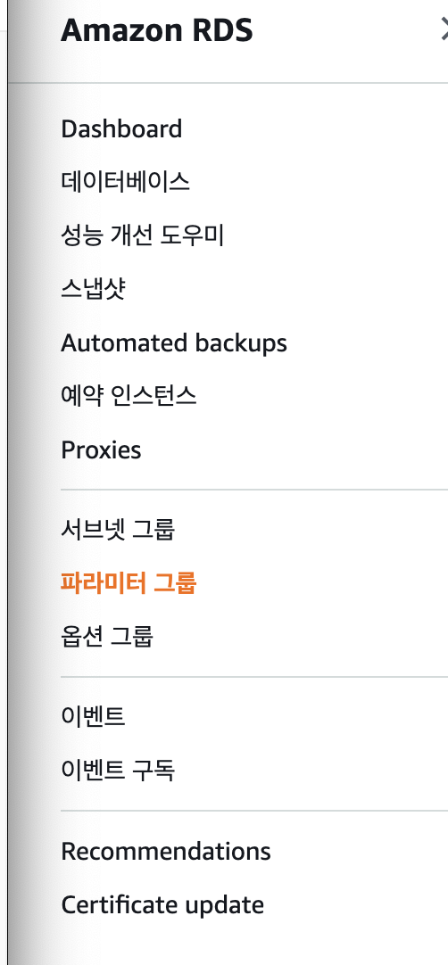 데이터베이스 생성 이후 왼편의 카테고리에서 파라미터 그룹으로 이동합니다.