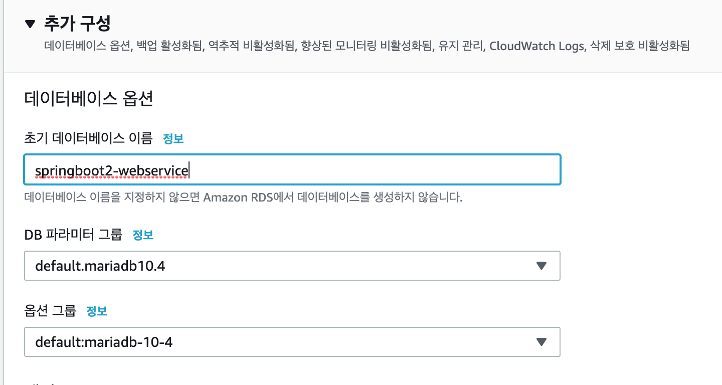 추가 구성에서 초기 데이터베이스 이름만 지정하고 파라미터 옵션은 기본값으로 설정한 후 생성합니다.